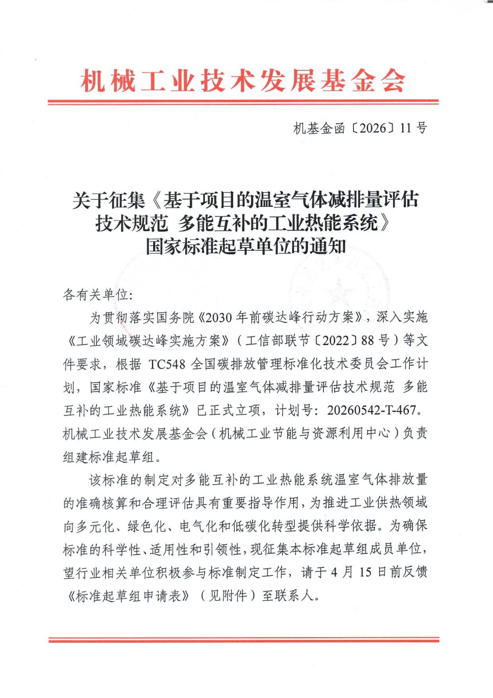 为贯彻落实国务院《2030年前碳达峰行动方案》,深入实施《工业领域碳达峰实施方案》(工信部联节〔2022〕88号)等文件要求。根据TC548全国碳排放管理标准化技术委员会工作计划,国家标准《基于项目的温室气体减排量评估技术规范 多能互补的工业热能系统》已正式立项,计划号:20260542-T-467。机械工业技术发展基金会(机械工业节能与资源利用中心)负责组建标准起草组。